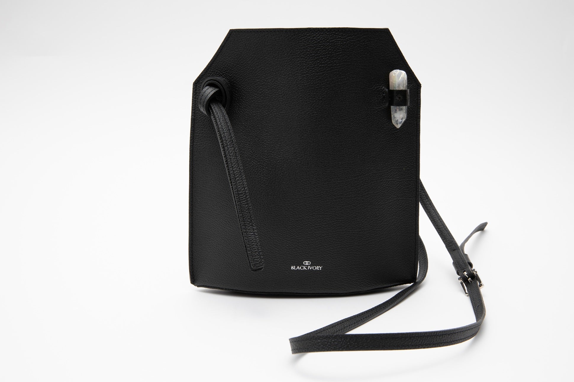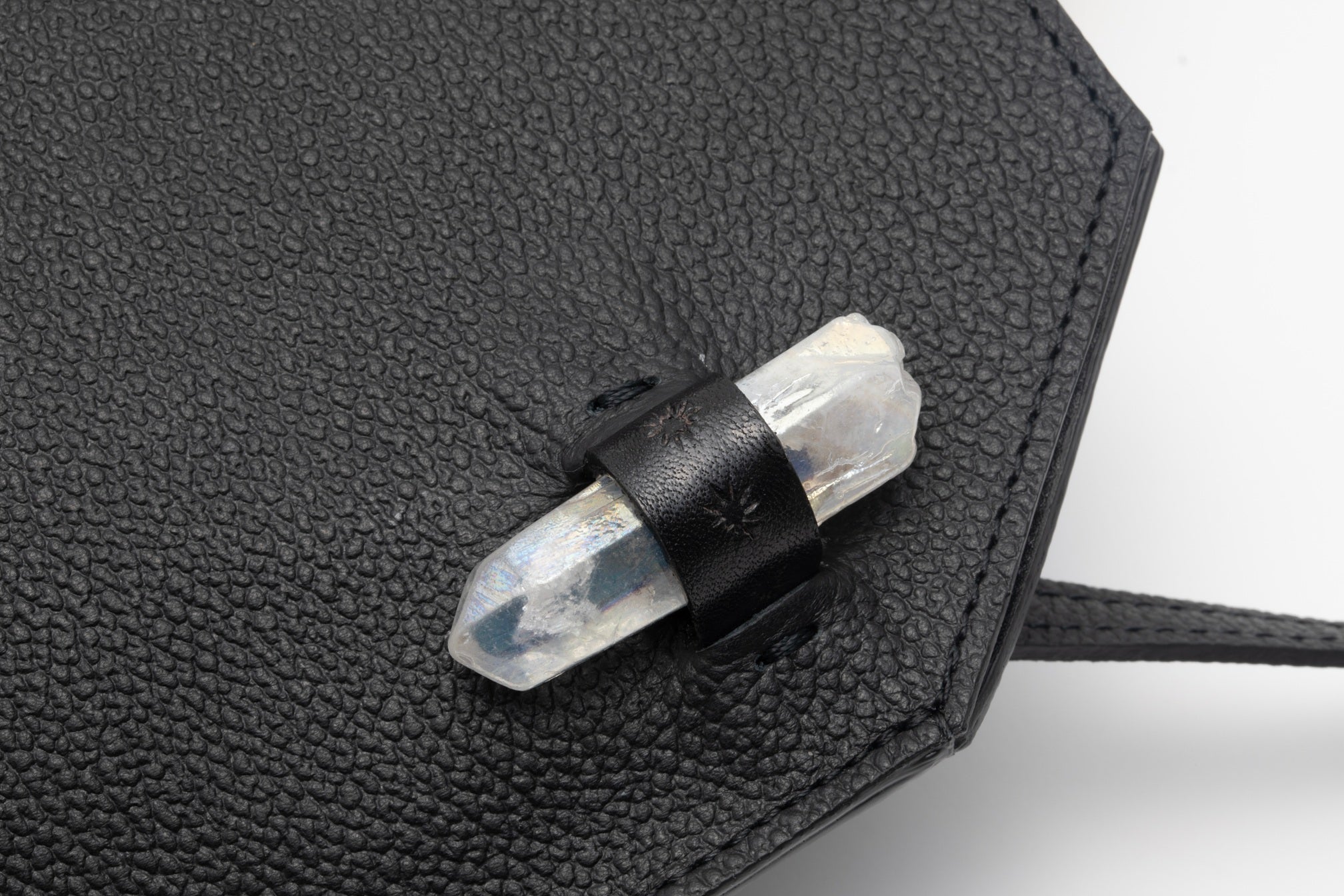 底マチ式のショルダーポーチは本体にフリンジベルトと天然水晶(アクアオーラ)を大胆にあしらいました。細部にも装飾をほどこし、アクセサリー感覚で身に着けることができます。