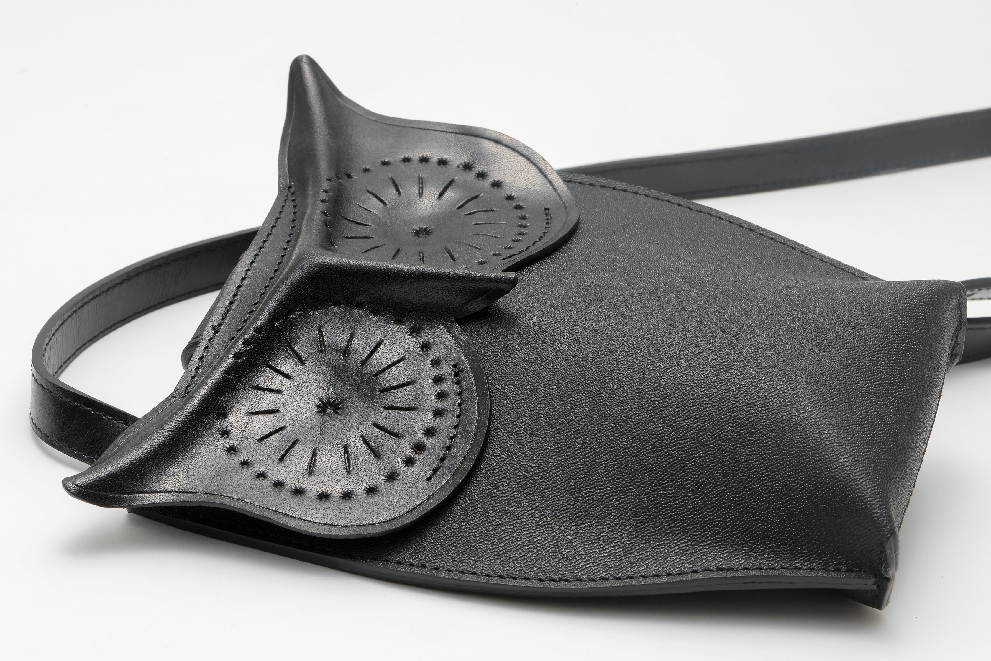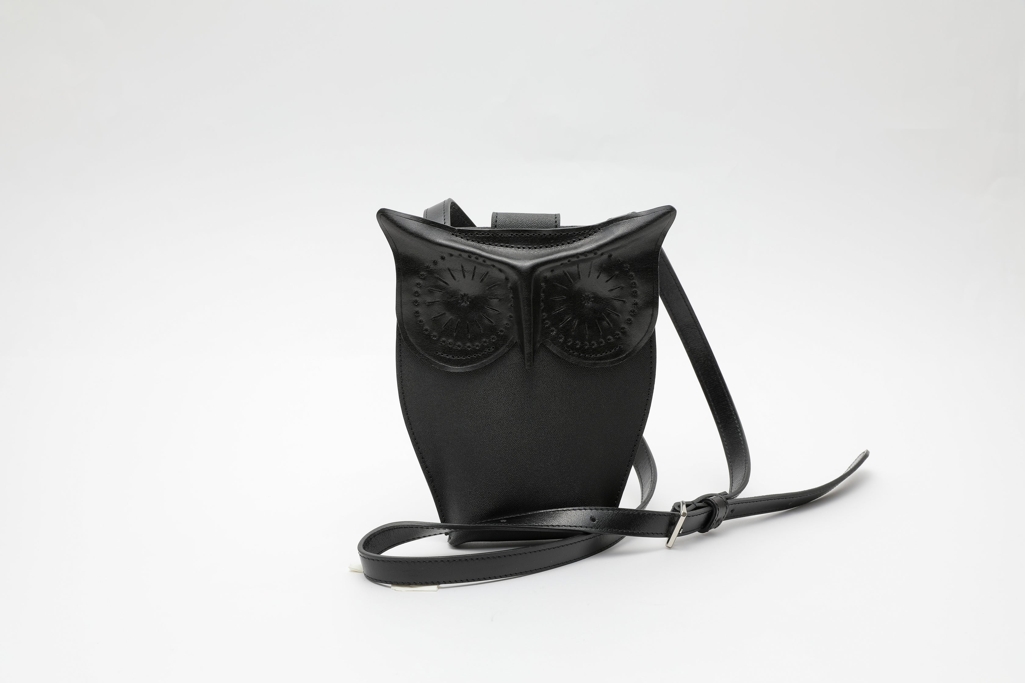 そんなフクロウを、打刻による紋様や、絞り成型など革の特性を最大限に生かして立体的に表現し、リアリティーを追求しました。